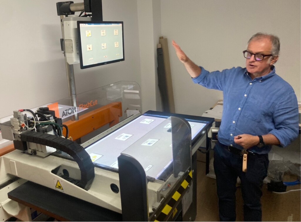 型紙だけではなく革のカットも可能な機械。イタリアの大規模なメーカーでは広く導入されているんだとか。